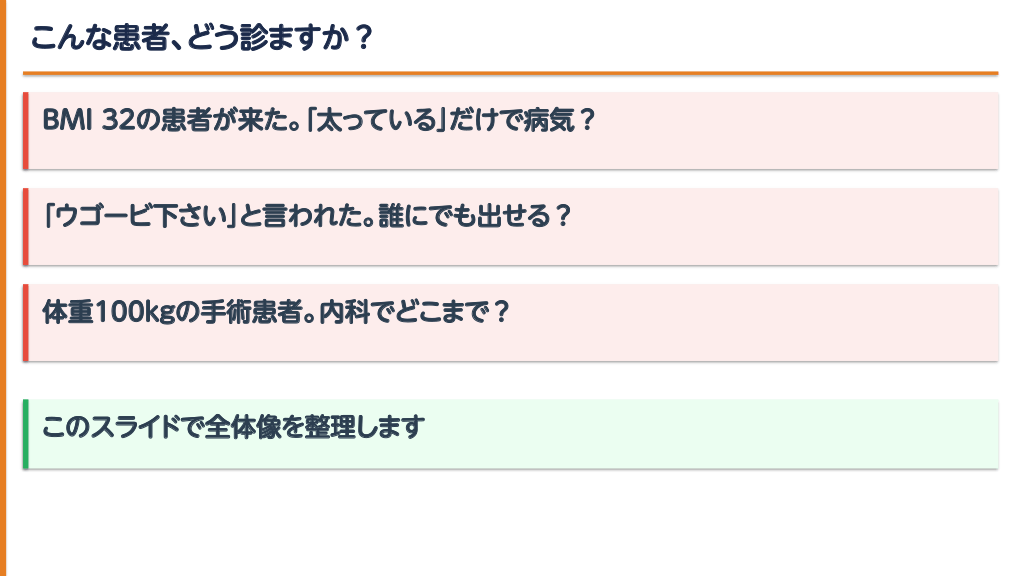 #2. こんな患者、どう診ますか? BMI 32の患者が来た。「太っている」だけで病気? 「ウゴービ下さい」と言われた。誰にでも出せる? 体重100kgの手術患者。内科でどこまで? このスライドで全体像を整理します