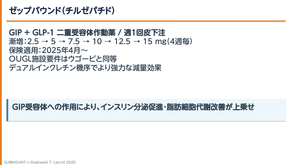 #21. ゼップバウンド(チルゼパチド) GIP + GLP-1 二重受容体作動薬 / 週1回皮下注 漸増:2.5 → 5 → 7.5 → 10 → 12.5 → 15 mg(4週毎) 保険適用:2025年4月~ OUGL施設要件はウゴービと同等 デュアルインクレチン機序でより強力な減量効果 GIP受容体への作用により、インスリン分泌促進・脂肪細胞代謝改善が上乗せ SURMOUNT-J (Kadowaki T. Lancet 2025)