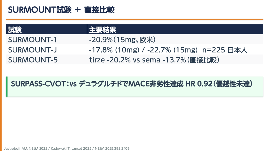 #22. SURMOUNT試験 + 直接比較 試験 SURMOUNT-1 主要結果 -20.9%(15mg、欧米) SURMOUNT-J SURMOUNT-5 -17.8% (10mg) / -22.7% (15mg) n=225 日本人 tirze -20.2% vs sema -13.7%(直接比較) SURPASS-CVOT:vs デュラグルチドでMACE非劣性達成 HR 0.92(優越性未達) Jastreboff AM. NEJM 2022 / Kadowaki T. Lancet 2025 / NEJM 2025;393:2409