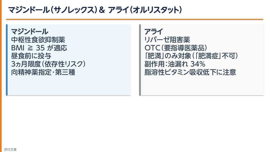 #23. マジンドール(サノレックス)& アライ(オルリスタット) マジンドール 中枢性食欲抑制薬 BMI ≧ 35 が適応 昼食前に投与 3ヵ月限度(依存性リスク) 向精神薬指定・第三種 添付文書 アライ リパーゼ阻害薬 OTC(要指導医薬品) 「肥満」のみ対象(「肥満症」不可) 副作用:油漏れ 34% 脂溶性ビタミン吸収低下に注意