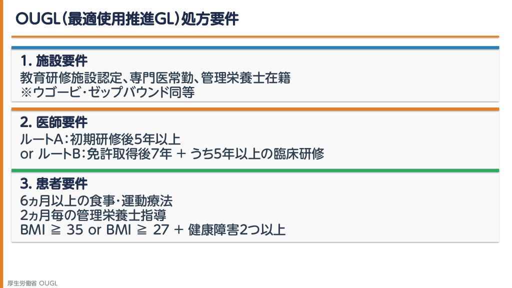 #24. OUGL(最適使用推進GL)処方要件 1. 施設要件 教育研修施設認定、専門医常勤、管理栄養士在籍 ※ウゴービ・ゼップバウンド同等 2. 医師要件 ルートA:初期研修後5年以上 or ルートB:免許取得後7年 + うち5年以上の臨床研修 3. 患者要件 6ヵ月以上の食事・運動療法 2ヵ月毎の管理栄養士指導 BMI ≧ 35 or BMI ≧ 27 + 健康障害2つ以上 厚生労働省 OUGL