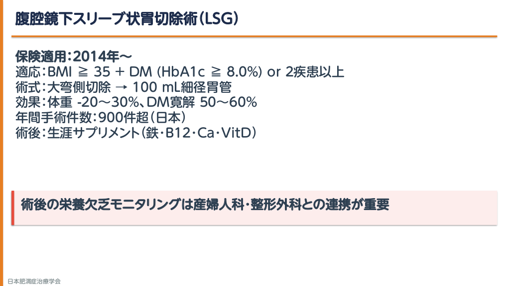 #26. 腹腔鏡下スリーブ状胃切除術(LSG) 保険適用:2014年~ 適応:BMI ≧ 35 + DM (HbA1c ≧ 8.0%) or 2疾患以上 術式:大弯側切除 → 100 mL細径胃管 効果:体重 -20〜30%、DM寛解 50〜60% 年間手術件数:900件超(日本) 術後:生涯サプリメント(鉄・B12・Ca・VitD) 術後の栄養欠乏モニタリングは産婦人科・整形外科との連携が重要 日本肥満症治療学会