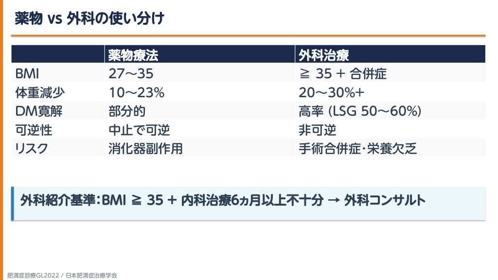 #27. 薬物 vs 外科の使い分け BMI 体重減少 DM寛解 可逆性 リスク 薬物療法 27〜35 外科治療 ≧ 35 + 合併症 10〜23% 部分的 中止で可逆 20〜30%+ 高率 (LSG 50〜60%) 非可逆 消化器副作用 手術合併症・栄養欠乏 外科紹介基準:BMI ≧ 35 + 内科治療6ヵ月以上不十分 → 外科コンサルト 肥満症診療GL2022 / 日本肥満症治療学会
