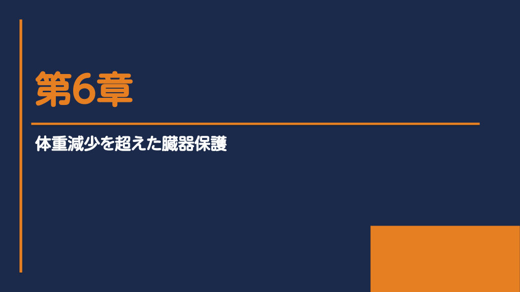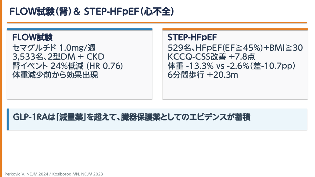 #30. FLOW試験(腎)& STEP-HFpEF(心不全) FLOW試験 セマグルチド 1.0mg/週 3,533名、2型DM + CKD 腎イベント 24%低減 (HR 0.76) 体重減少前から効果出現 STEP-HFpEF 529名、HFpEF(EF≧45%)+BMI≧30 KCCQ-CSS改善 +7.8点 体重 -13.3% vs -2.6%(差-10.7pp) 6分間歩行 +20.3m GLP-1RAは「減量薬」を超えて、臓器保護薬としてのエビデンスが蓄積 Perkovic V. NEJM 2024 / Kosiborod MN. NEJM 2023
