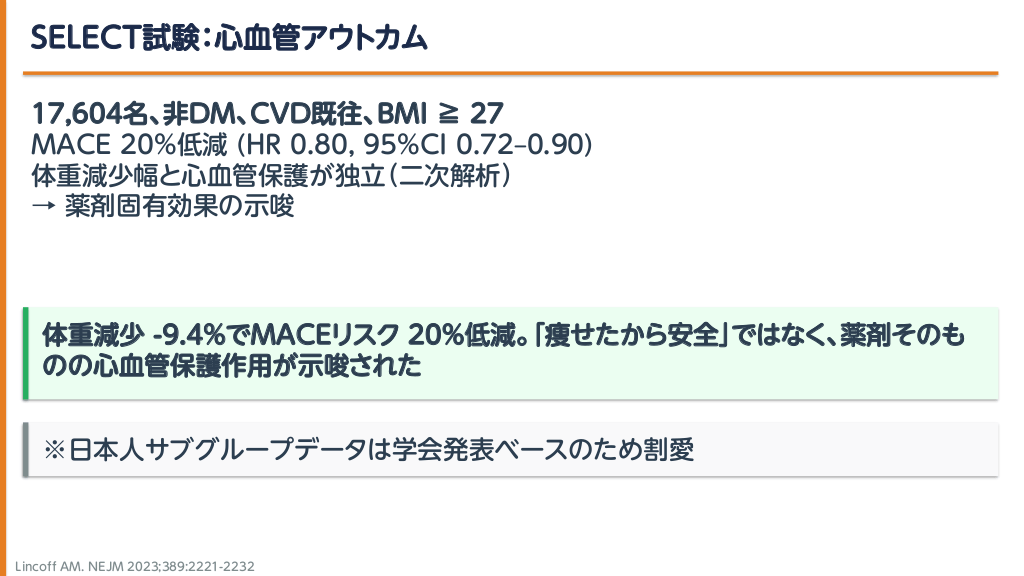 #29. SELECT試験:心血管アウトカム 17,604名、非DM、CVD既往、BMI ≧ 27 MACE 20%低減 (HR 0.80, 95%CI 0.72–0.90) 体重減少幅と心血管保護が独立(二次解析) → 薬剤固有効果の示唆 体重減少 -9.4%でMACEリスク 20%低減。「痩せたから安全」ではなく、薬剤そのも のの心血管保護作用が示唆された ※日本人サブグループデータは学会発表ベースのため割愛 Lincoff AM. NEJM 2023;389:2221-2232