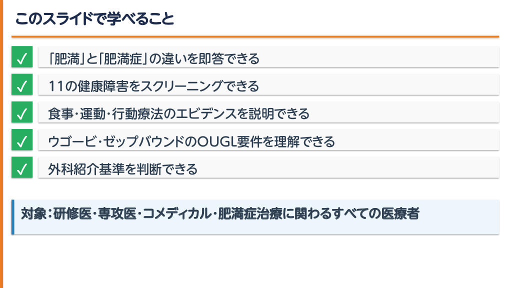 #3. このスライドで学べること ✓ 「肥満」と「肥満症」の違いを即答できる ✓ 11の健康障害をスクリーニングできる ✓ 食事・運動・行動療法のエビデンスを説明できる ✓ ウゴービ・ゼップバウンドのOUGL要件を理解できる ✓ 外科紹介基準を判断できる 対象:研修医・専攻医・コメディカル・肥満症治療に関わるすべての医療者