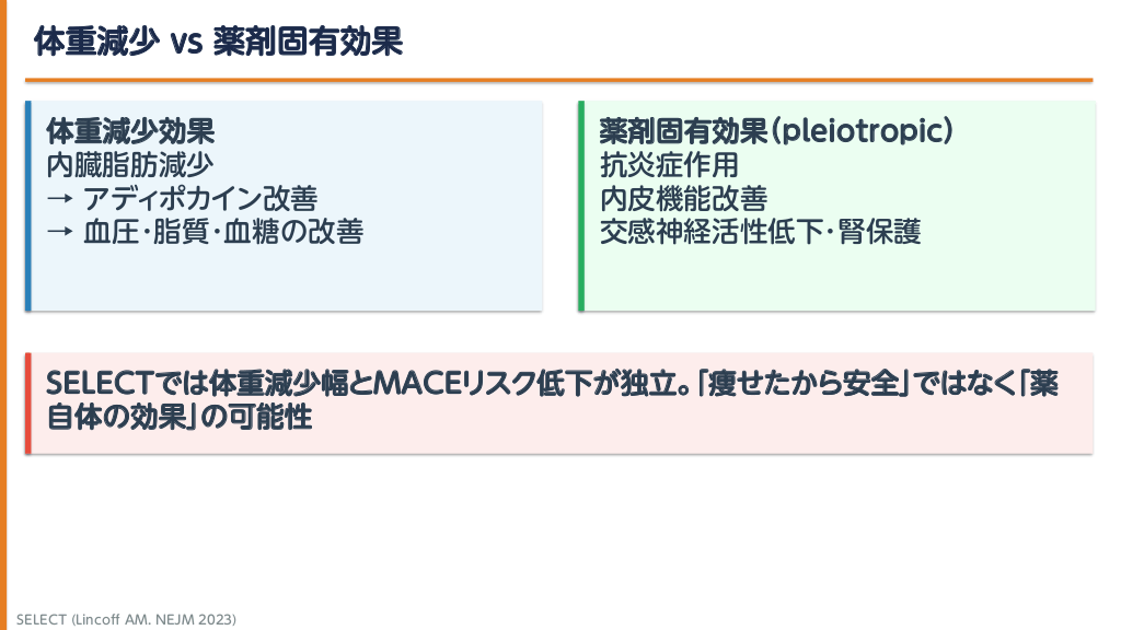 #31. 体重減少 vs 薬剤固有効果 体重減少効果 内臓脂肪減少 → アディポカイン改善 → 血圧・脂質・血糖の改善 薬剤固有効果(pleiotropic) 抗炎症作用 内皮機能改善 交感神経活性低下・腎保護 SELECTでは体重減少幅とMACEリスク低下が独立。「痩せたから安全」ではなく「薬 自体の効果」の可能性 SELECT (Lincoff AM. NEJM 2023)