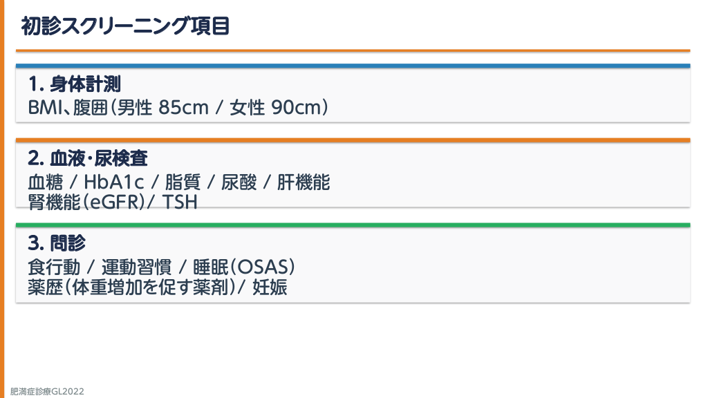 #33. 初診スクリーニング項目 1. 身体計測 BMI、腹囲(男性 85cm / 女性 90cm) 2. 血液・尿検査 血糖 / HbA1c / 脂質 / 尿酸 / 肝機能 腎機能(eGFR)/ TSH 3. 問診 食行動 / 運動習慣 / 睡眠(OSAS) 薬歴(体重増加を促す薬剤)/ 妊娠 肥満症診療GL2022