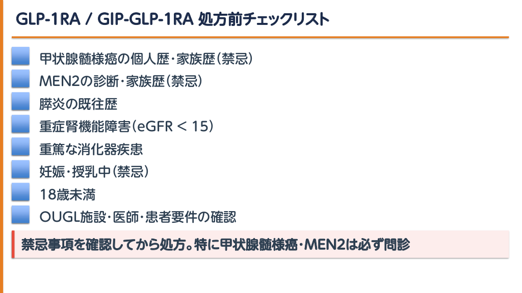 #34. GLP-1RA / GIP-GLP-1RA 処方前チェックリスト 甲状腺髄様癌の個人歴・家族歴(禁忌) MEN2の診断・家族歴(禁忌) 膵炎の既往歴 重症腎機能障害(eGFR < 15) 重篤な消化器疾患 妊娠・授乳中(禁忌) 18歳未満 OUGL施設・医師・患者要件の確認 禁忌事項を確認してから処方。特に甲状腺髄様癌・MEN2は必ず問診