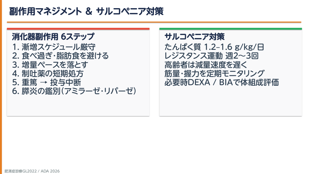 #35. 副作用マネジメント & サルコペニア対策 消化器副作用 6ステップ 1. 漸増スケジュール厳守 2. 食べ過ぎ・脂肪食を避ける 3. 増量ペースを落とす 4. 制吐薬の短期処方 5. 重篤 → 投与中断 6. 膵炎の鑑別(アミラーゼ・リパーゼ) 肥満症診療GL2022 / ADA 2026 サルコペニア対策 たんぱく質 1.2–1.6 g/kg/日 レジスタンス運動 週2〜3回 高齢者は減量速度を遅く 筋量・握力を定期モニタリング 必要時DEXA / BIAで体組成評価