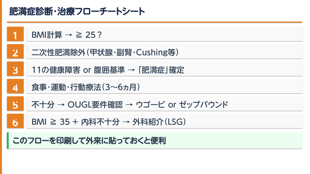 #37. 肥満症診断・治療フローチートシート 1 ↓ 2 ↓ 3 ↓ 4 ↓ 5 ↓ 6 BMI計算 → ≧ 25? 二次性肥満除外(甲状腺・副腎・Cushing等) 11の健康障害 or 腹囲基準 → 「肥満症」確定 食事・運動・行動療法(3〜6ヵ月) 不十分 → OUGL要件確認 → ウゴービ or ゼップバウンド BMI ≧ 35 + 内科不十分 → 外科紹介(LSG) このフローを印刷して外来に貼っておくと便利