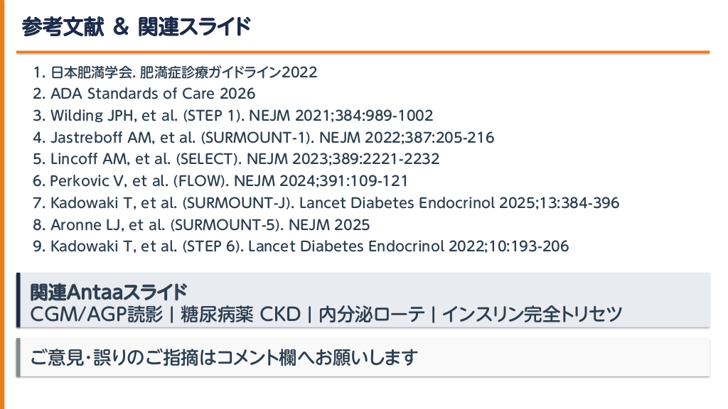 #38. 参考文献 & 関連スライド 1. 日本肥満学会. 肥満症診療ガイドライン2022 2. ADA Standards of Care 2026 3. Wilding JPH, et al. (STEP 1). NEJM 2021;384:989-1002 4. Jastreboff AM, et al. (SURMOUNT-1). NEJM 2022;387:205-216 5. Lincoff AM, et al. (SELECT). NEJM 2023;389:2221-2232 6. Perkovic V, et al. (FLOW). NEJM 2024;391:109-121 7. Kadowaki T, et al. (SURMOUNT-J). Lancet Diabetes Endocrinol 2025;13:384-396 8. Aronne LJ, et al. (SURMOUNT-5). NEJM 2025 9. Kadowaki T, et al. (STEP 6). Lancet Diabetes Endocrinol 2022;10:193-206 関連Antaaスライド CGM/AGP読影 | 糖尿病薬 CKD | 内分泌ローテ | インスリン完全トリセツ ご意見・誤りのご指摘はコメント欄へお願いします