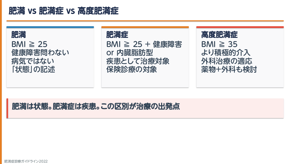 #5. 肥満 vs 肥満症 vs 高度肥満症 肥満 BMI ≧ 25 健康障害問わない 病気ではない 「状態」の記述 肥満症 BMI ≧ 25 + 健康障害 or 内臓脂肪型 疾患として治療対象 保険診療の対象 肥満は状態。肥満症は疾患。この区別が治療の出発点 肥満症診療ガイドライン2022 高度肥満症 BMI ≧ 35 より積極的介入 外科治療の適応 薬物+外科も検討