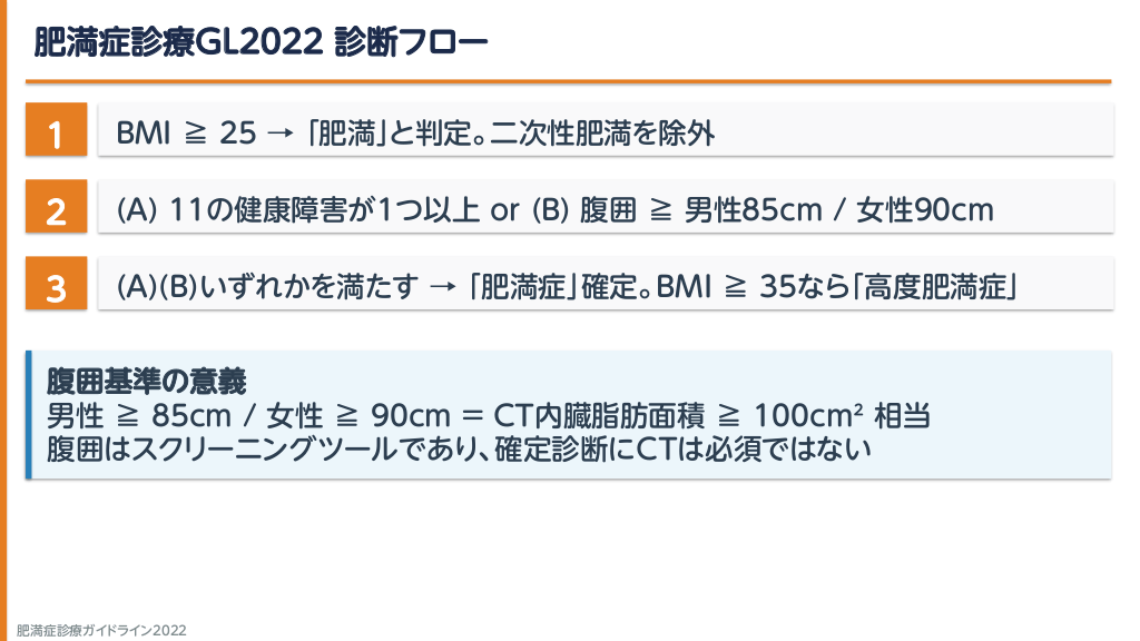 #6. 肥満症診療GL2022 診断フロー 1 BMI ≧ 25 → 「肥満」と判定。二次性肥満を除外 2 (A) 11の健康障害が1つ以上 or (B) 腹囲 ≧ 男性85cm / 女性90cm 3 (A)(B)いずれかを満たす → 「肥満症」確定。BMI ≧ 35なら「高度肥満症」 腹囲基準の意義 男性 ≧ 85cm / 女性 ≧ 90cm = CT内臓脂肪面積 ≧ 100cm² 相当 腹囲はスクリーニングツールであり、確定診断にCTは必須ではない 肥満症診療ガイドライン2022