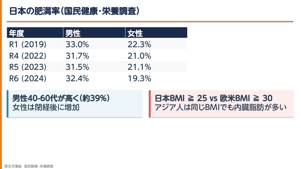 #7. 日本の肥満率(国民健康・栄養調査) 年度 R1 (2019) 男性 33.0% 女性 22.3% R4 (2022) R5 (2023) R6 (2024) 31.7% 31.5% 32.4% 21.0% 21.1% 19.3% 男性40-60代が高く(約39%) 女性は閉経後に増加 厚生労働省 国民健康・栄養調査 日本BMI ≧ 25 vs 欧米BMI ≧ 30 アジア人は同じBMIでも内臓脂肪が多い