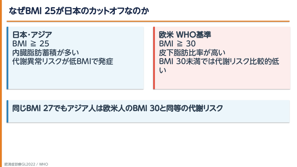 #8. なぜBMI 25が日本のカットオフなのか 日本・アジア BMI ≧ 25 内臓脂肪蓄積が多い 代謝異常リスクが低BMIで発症 欧米 WHO基準 BMI ≧ 30 皮下脂肪比率が高い BMI 30未満では代謝リスク比較的低 い 同じBMI 27でもアジア人は欧米人のBMI 30と同等の代謝リスク 肥満症診療GL2022 / WHO