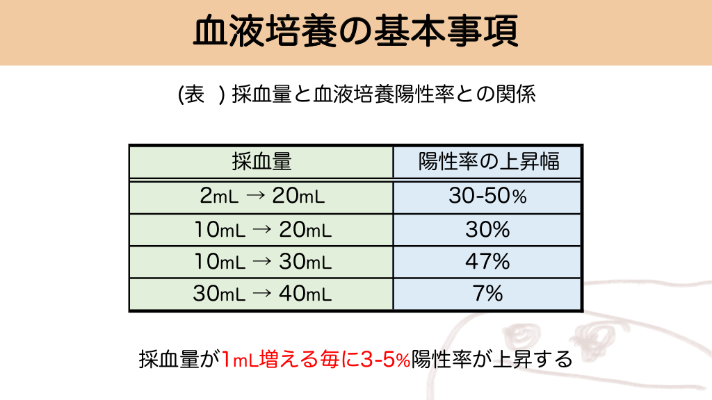 #10. 血液培養の基本事項 (表2) 採血量と血液培養陽性率との関係 採血量 陽性率の上昇幅 2mL → 20mL 30-50% 10mL → 20mL 30% 30mL → 40mL 7% 10mL → 30mL 47% 採血量が1mL増える毎に3-5%陽性率が上昇する