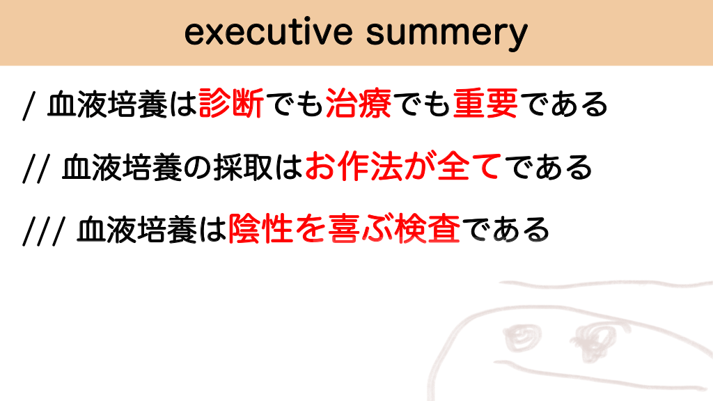 #2. executive summery / 血液培養は診断でも治療でも重要である // 血液培養の採取はお作法が全てである /// 血液培養は陰性を喜ぶ検査である