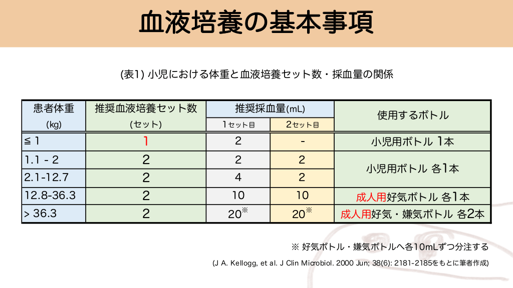 #8. 血液培養の基本事項 (表1) 小児における体重と血液培養セット数・採血量の関係 患者体重 推奨血液培養セット数 (kg) (セット) 1 1.1 - 2 2.1-12.7 12.8-36.3 > 36.3 1 2 2 2 2 推奨採血量(mL) 1 セット目 2 セット目 2 - 2 2 4 2 10 10 20※ 20※ 使用するボトル 小児用ボトル 1本 小児用ボトル 各1本 成人用好気ボトル 各1本 成人用好気・嫌気ボトル 各2本 ※ 好気ボトル・嫌気ボトルへ各10mLずつ分注する (J A. Kellogg, et al. J Clin Microbiol. 2000 Jun; 38(6): 2181-2185をもとに筆者作成)