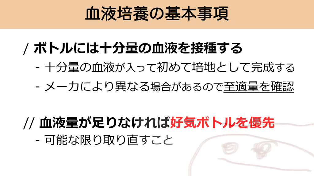 #9. 血液培養の基本事項 / ボトルには⼗分量の⾎液を接種する - ⼗分量の⾎液が⼊って初めて培地として完成する - メーカにより異なる場合があるので⾄適量を確認 // ⾎液量が⾜りなければ好気ボトルを優先 - 可能な限り取り直すこと
