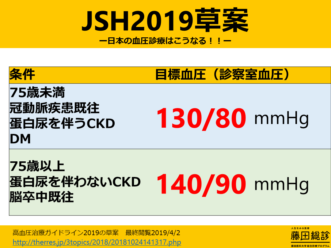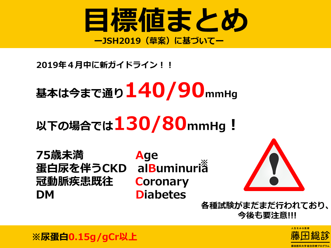 #20. 目標値まとめ 2019年4月中に新ガイドライン!! 基本は今まで通り140/90mmHg 以下の場合では130/80mmHg!