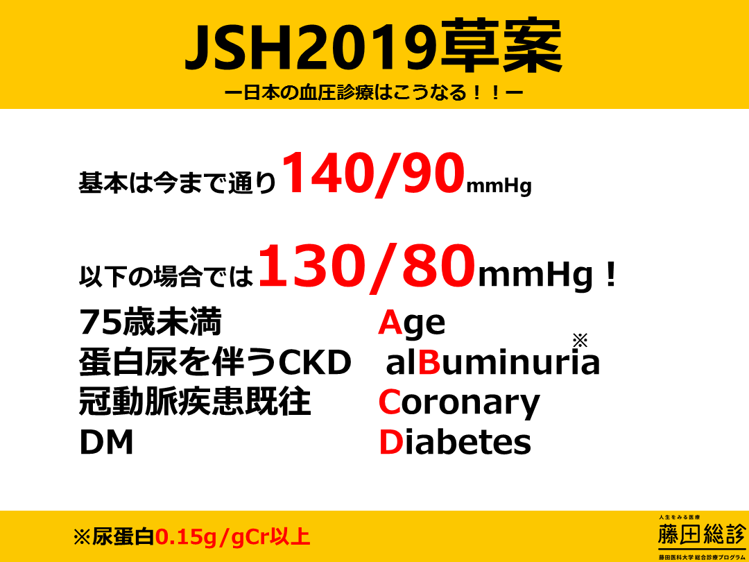 #19. JSH2019草案 ー日本の血圧診療はこうなる!!ー 以下の場合では130/80mmHg!75歳未満 Age蛋白尿を伴うCKD alBuminuria冠動脈疾患既往 CoronaryDM Diabetes 基本は今まで通り140/90mmHg ※尿蛋白0.15g/gCr以上 ※