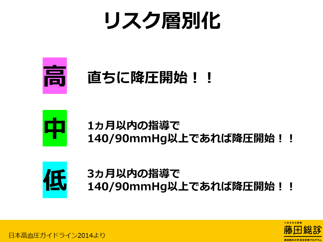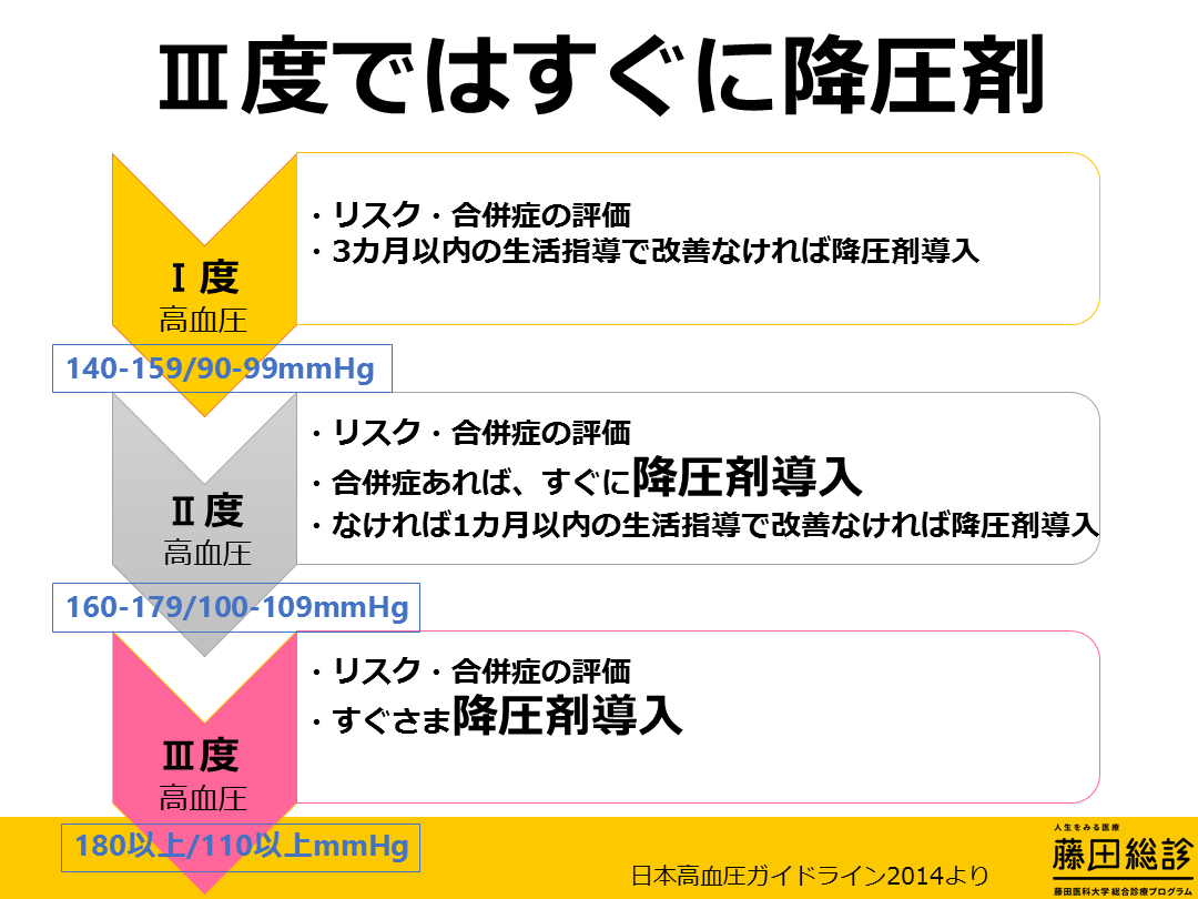 ・すぐさま降圧剤導入 140-159/90-99mmHg 160-179/100-109mmHg 180以上/110以上mmHg 日本高血圧ガイドライン2014より