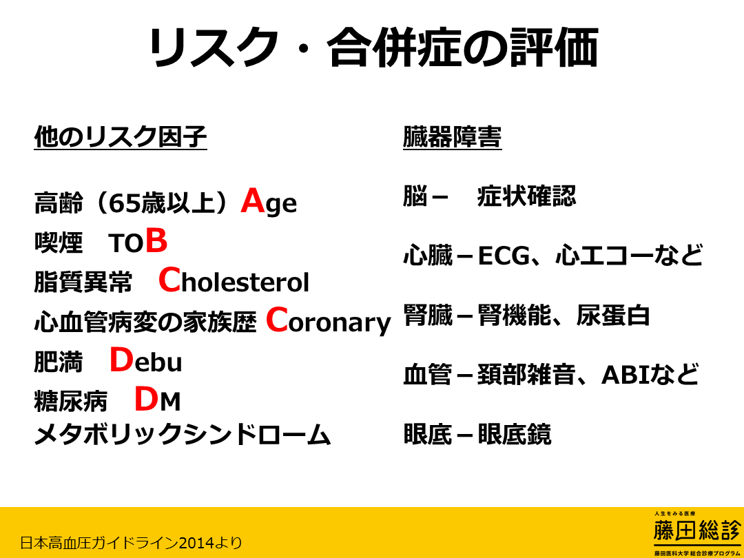 ・なければ1カ月以内の生活指導で改善なければ降圧剤導入 ・リスク・合併症の評価