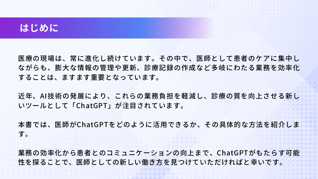 #2. はじめに 医療の現場は、常に進化し続けています。その中で、医師として患者のケアに集中し ながらも、膨大な情報の管理や更新、診療記録の作成など多岐にわたる業務を効率化 することは、ますます重要となっています。 近年、AI技術の発展により、これらの業務負担を軽減し、診療の質を向上させる新し いツールとして「ChatGPT」が注目されています。 本書では、医師がChatGPTをどのように活用できるか、その具体的な方法を紹介しま す。 業務の効率化から患者とのコミュニケーションの向上まで、ChatGPTがもたらす可能 性を探ることで、医師としての新しい働き方を見つけていただければと幸いです。