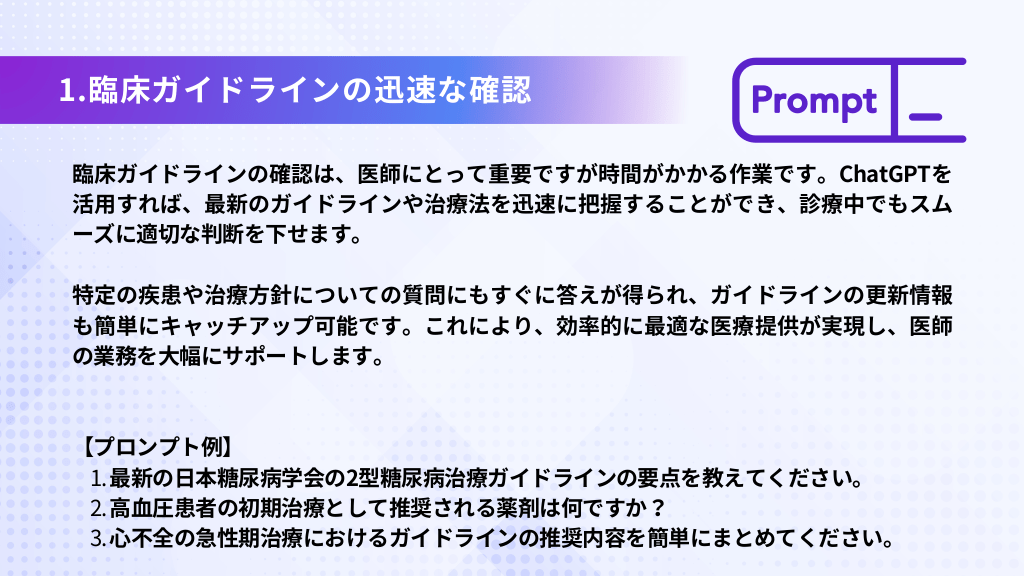 #4. 1.臨床ガイドラインの迅速な確認 臨床ガイドラインの確認は、医師にとって重要ですが時間がかかる作業です。ChatGPTを 活用すれば、最新のガイドラインや治療法を迅速に把握することができ、診療中でもスム ーズに適切な判断を下せます。 特定の疾患や治療方針についての質問にもすぐに答えが得られ、ガイドラインの更新情報 も簡単にキャッチアップ可能です。これにより、効率的に最適な医療提供が実現し、医師 の業務を大幅にサポートします。 【プロンプト例】 1. 最新の日本糖尿病学会の2型糖尿病治療ガイドラインの要点を教えてください。 2. 高血圧患者の初期治療として推奨される薬剤は何ですか? 3. 心不全の急性期治療におけるガイドラインの推奨内容を簡単にまとめてください。