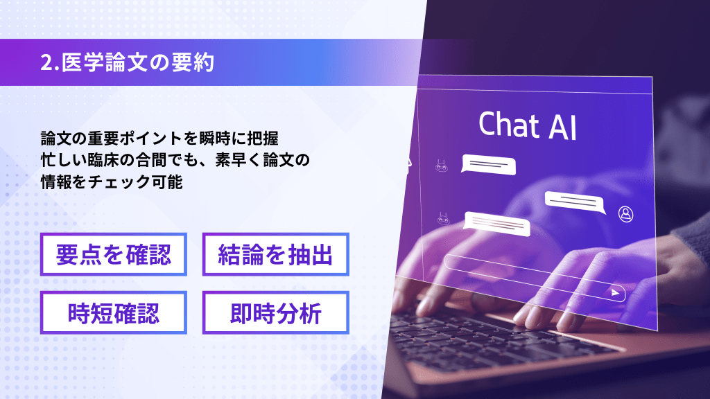 #5. 2.医学論文の要約 論文の重要ポイントを瞬時に把握 忙しい臨床の合間でも、素早く論文の 情報をチェック可能 要点を確認 結論を抽出 時短確認 即時分析