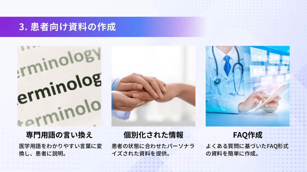 #6. 3. 患者向け資料の作成 専門用語の言い換え 個別化された情報 FAQ作成 医学用語をわかりやすい言葉に変 換し、患者に説明。 患者の状態に合わせたパーソナラ イズされた資料を提供。 よくある質問に基づいたFAQ形式 の資料を簡単に作成。