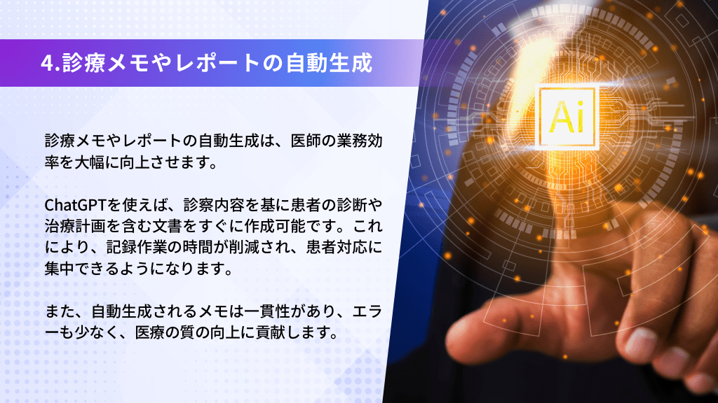 #7. 4.診療メモやレポートの自動生成 診療メモやレポートの自動生成は、医師の業務効 率を大幅に向上させます。 ChatGPTを使えば、診察内容を基に患者の診断や 治療計画を含む文書をすぐに作成可能です。これ により、記録作業の時間が削減され、患者対応に 集中できるようになります。 また、自動生成されるメモは一貫性があり、エラ ーも少なく、医療の質の向上に貢献します。