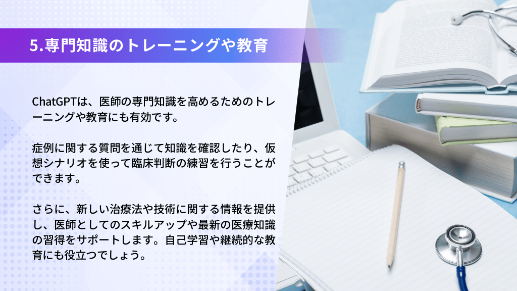 #8. 5.専門知識のトレーニングや教育 ChatGPTは、医師の専門知識を高めるためのトレ ーニングや教育にも有効です。 症例に関する質問を通じて知識を確認したり、仮 想シナリオを使って臨床判断の練習を行うことが できます。 さらに、新しい治療法や技術に関する情報を提供 し、医師としてのスキルアップや最新の医療知識 の習得をサポートします。自己学習や継続的な教 育にも役立つでしょう。
