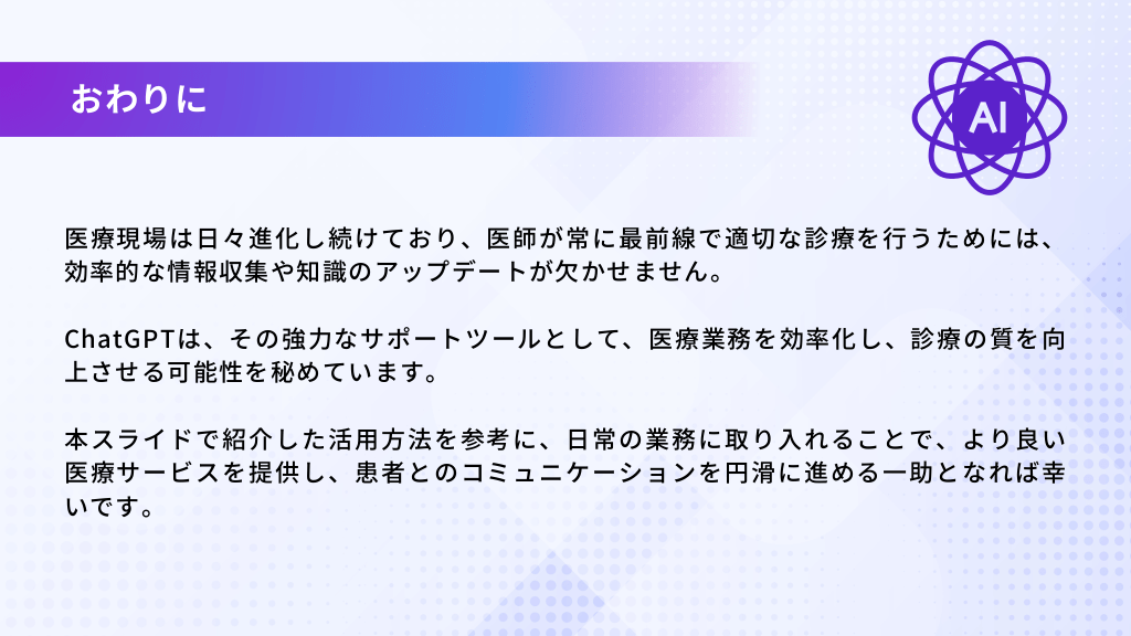 #9. おわりに 医療現場は日々進化し続けており、医師が常に最前線で適切な診療を行うためには、 効率的な情報収集や知識のアップデートが欠かせません。 ChatGPTは、その強力なサポートツールとして、医療業務を効率化し、診療の質を向 上させる可能性を秘めています。 本スライドで紹介した活用方法を参考に、日常の業務に取り入れることで、より良い 医療サービスを提供し、患者とのコミュニケーションを円滑に進める一助となれば幸 いです。