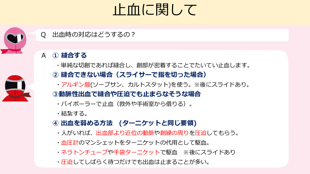 #10. 止血に関して Q 出血時の対応はどうするの? A ① 縫合する ・単純な切創であれば縫合し、創部が密着することでたいてい止血します。 ② 縫合できない場合(スライサーで指を切った場合) ・アルギン酸(ソーブサン、カルトスタット)を使う。※後にスライドあり。 ③動脈性出血で縫合や圧迫でも止まらなそうな場合 ・バイポーラーで止血(救外や手術室から借りる)。 ・結紮する。 ④ 出血を弱める方法 (ターニケットと同じ要領) ・人がいれば、出血部より近位の動脈や創縁の周りを圧迫してもらう。 ・血圧計のマンシェットをターニケットの代用として駆血。 ・ネラトンチューブや手袋ターニケットで駆血 ※後にスライドあり ・圧迫してしばらく待つだけでも出血は止まることが多い。