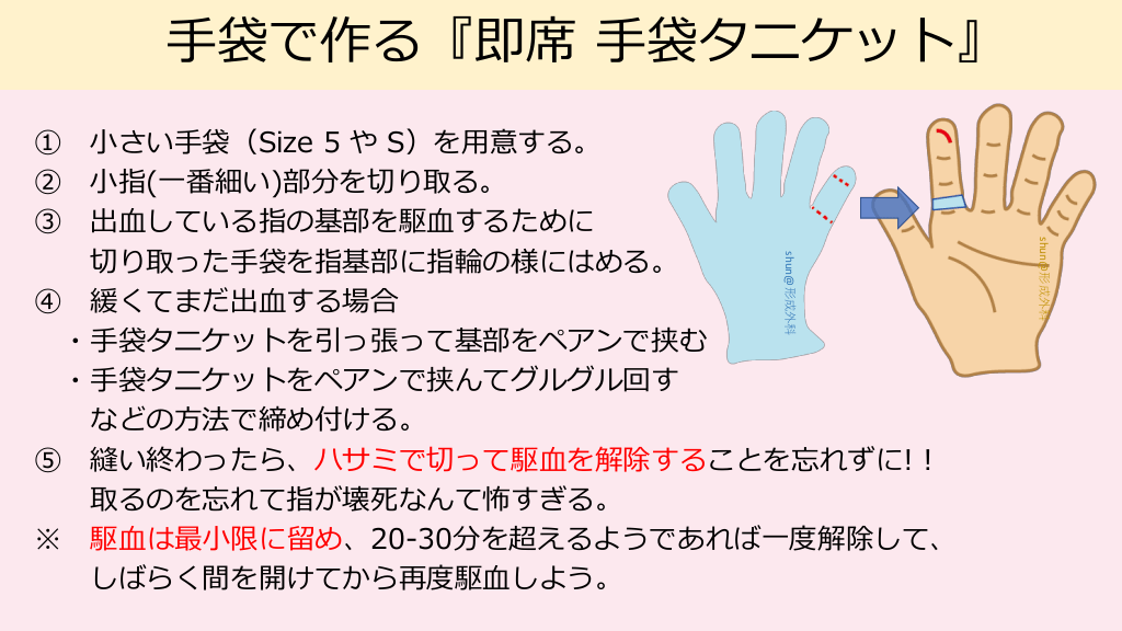 #11. 手袋で作る『即席 手袋タニケット』 shun@形成外科 shun@形成外科 ① 小さい手袋(Size 5 や S)を用意する。 ② 小指(一番細い)部分を切り取る。 ③ 出血している指の基部を駆血するために 切り取った手袋を指基部に指輪の様にはめる。 ④ 緩くてまだ出血する場合 ・手袋タニケットを引っ張って基部をペアンで挟む ・手袋タニケットをペアンで挟んてグルグル回す などの方法で締め付ける。 ⑤ 縫い終わったら、ハサミで切って駆血を解除することを忘れずに!! 取るのを忘れて指が壊死なんて怖すぎる。 ※ 駆血は最小限に留め、20-30分を超えるようであれば一度解除して、 しばらく間を開けてから再度駆血しよう。