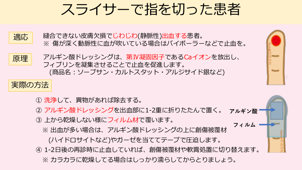 #12. スライサーで指を切った患者 縫合できない皮膚欠損でじわじわ(静脈性)出血する患者。 ※ 傷が深く動脈性に血が吹いている場合はバイポーラーなどで止血を。 原理 アルギン酸ドレッシングは、第Ⅳ凝固因子であるCaイオンを放出し、 フィブリンを凝集させることで止血を促進します。 (商品名:ソーブサン・カルトスタット・アルジサイド銀など) shun@形成外科 適応 実際の方法 ① 洗浄して、異物があれば除去する。 ② アルギン酸ドレッシングを出血部に1-2重に折りたたんで置く。 アルギン酸 ③ 上から乾燥しない様にフィルム材で覆います。 (ハイドロサイトなど)やガーゼを当ててテープで圧迫します。 ④ 1-2日後の再診時に止血していれば、創傷被覆材や軟膏処置に切り替えます。 ※ カラカラに乾燥してる場合はしっかり濡らしてからとりましょう。 shun@形成外科 ※ 出血が多い場合は、アルギン酸ドレッシングの上に創傷被覆材 フィルム