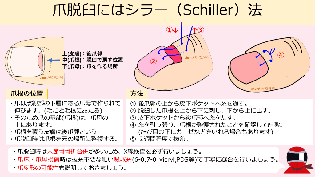 #13. 爪脱臼にはシラー(Schiller)法 ①↓ 上(皮膚):後爪郭 中(爪根):脱臼で戻す位置 下(爪母):爪を作る場所 ② ↑③ ④ shun@形成外科 shun@形成外科 爪根の位置 ・爪は点線部の下層にある爪母で作られて 伸びます。(毛だと毛根にあたる) ・そのため爪の基部(爪根)は、爪母の 上にあります。 ・爪根を覆う皮膚は後爪郭という。 ・爪脱臼時は爪根を元の場所に整復する。 方法 shun@形成外科 ① ② ③ ④ 後爪郭の上から皮下ポケットへ糸を通す。 脱臼した爪根を上から下に刺し、下から上に出す。 皮下ポケットから後爪郭へ糸をだす。 糸を引っ張り、爪根が整復されたことを確認して結紮。 (結び目の下にガーゼなどをいれる場合もあります) ⑤ 2週間程度で抜糸。 ・爪脱臼時は末節骨骨折合併が多いため、X線検査を必ず行いましょう。 ・爪床・爪母損傷時は抜糸不要な細い吸収糸(6-0,7-0 vicryl,PDS等)で丁寧に縫合を行いましょう。 ・爪変形の可能性も説明しておきましょう。