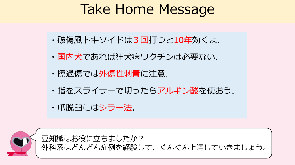 #14. Take Home Message ・破傷風トキソイドは3回打つと10年効くよ. ・国内犬であれば狂犬病ワクチンは必要ない. ・擦過傷では外傷性刺青に注意. ・指をスライサーで切ったらアルギン酸を使おう. ・爪脱臼にはシラー法. 豆知識はお役に立ちましたか? 外科系はどんどん症例を経験して、ぐんぐん上達していきましょう。