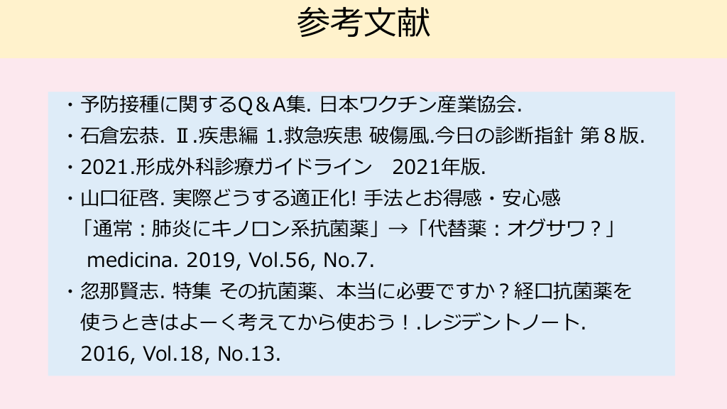 #15. 参考文献 ・予防接種に関するQ&A集. 日本ワクチン産業協会. ・石倉宏恭. Ⅱ.疾患編 1.救急疾患 破傷風.今日の診断指針 第8版. ・2021.形成外科診療ガイドライン 2021年版. ・山口征啓. 実際どうする適正化! 手法とお得感・安心感 「通常:肺炎にキノロン系抗菌薬」→「代替薬:オグサワ?」 medicina. 2019, Vol.56, No.7. ・忽那賢志. 特集 その抗菌薬、本当に必要ですか?経口抗菌薬を 使うときはよーく考えてから使おう!.レジデントノート. 2016, Vol.18, No.13.