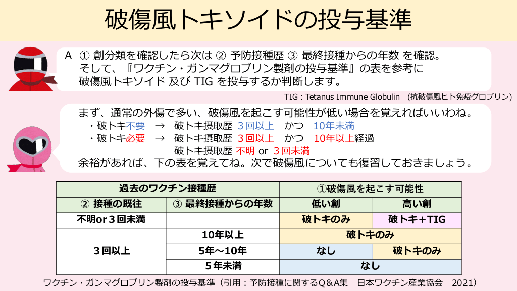 #4. 破傷風トキソイドの投与基準 A ① 創分類を確認したら次は ② 予防接種歴 ③ 最終接種からの年数 を確認。 そして、『ワクチン・ガンマグロブリン製剤の投与基準』の表を参考に 破傷風トキソイド 及び TIG を投与するか判断します。 TIG:Tetanus Immune Globulin (抗破傷風ヒト免疫グロブリン) まず、通常の外傷で多い、破傷風を起こす可能性が低い場合を覚えればいいわね。 ・破トキ不要 ・破トキ必要 → → 破トキ摂取歴 3回以上 かつ 10年未満 破トキ摂取歴 3回以上 かつ 10年以上経過 破トキ摂取歴 不明 or 3回未満 余裕があれば、下の表を覚えてね。次で破傷風についても復習しておきましょう。 過去のワクチン接種歴 ② 接種の既往 ③ 最終接種からの年数 不明or3回未満 ①破傷風を起こす可能性 低い創 高い創 破トキのみ 破トキ+TIG 10年以上 3回以上 5年~10年 破トキのみ なし 5年未満 ワクチン・ガンマグロブリン製剤の投与基準(引用:予防接種に関するQ&A集 破トキのみ なし 日本ワクチン産業協会 2021)