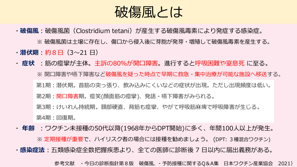 #5. 破傷風とは ・破傷風:破傷風菌(Clostridium tetani)が産生する破傷風毒素により発症する感染症。 ※ 破傷風菌は土壌に存在し、傷口から侵入後に芽胞が発芽・増殖して破傷風毒素を産生する。 ・潜伏期:約8日(3~21 日) ・ 症状 :筋の痙攣が主体。主訴の80%が開口障害。進行すると呼吸困難や窒息死 に至る。 ※ 開口障害や嚥下障害など破傷風を疑った時点で早期に救急・集中治療が可能な施設へ移送する。 第1期:潜伏期。首筋の突っ張り、飲み込みにくいなどの症状が出現。ただし出現頻度は低い。 第2期:開口障害期。痙笑(顔面筋の痙攣)、発語・嚥下障害がみられる。 第3期:けいれん持続期。頚部硬直、背筋も痙攣、やがて呼吸筋麻痺で呼吸障害が生じる。 第4期:回復期。 ・ 年齢 :ワクチン未接種の50代以降(1968年からDPT開始)に多く、年間100人以上が発生。 ※ 定期接種が重要で、ハイリスク者の場合には接種を勧めましょう。 (DPT: 3種混合ワクチン) ・感染症法:五類感染症全数把握疾患より、全ての医師に診断後 7 日以内に届出義務がある。 参考文献 ・今日の診断指針第8版 破傷風. ・予防接種に関するQ&A集 日本ワクチン産業協会 2021)
