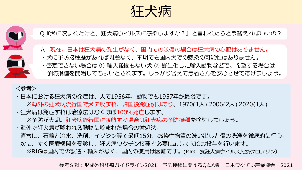 #6. 狂犬病 Q『犬に咬まれたけど、狂犬病ウイルスに感染しますか?』と言われたらどう答えればいいの? A 現在、日本は狂犬病の発生がなく、国内での咬傷の場合は狂犬病の心配はありません。 ・犬に予防接種歴があれば問題なく、不明でも国内犬での感染の可能性はありません。 ・否定できない場合は ① 輸入後間もない犬 ② 野生化した輸入動物などで、希望する場合は 予防接種を開始してもよいとされます。しっかり答えて患者さんを安心させてあげましょう。 <参考> ・日本における狂犬病の発症は、人で1956年、動物でも1957年が最後です。 ※海外の狂犬病流行国で犬に咬まれ、帰国後発症例はあり。1970(1人) 2006(2人) 2020(1人) ・狂犬病は発症すれば治療法はなくほぼ100%死亡します。 ※予防が大切。狂犬病流行国に渡航する場合は狂犬病の予防接種を検討しましょう。 ・海外で狂犬病が疑われる動物に咬まれた場合の対処法。 直ちに、石鹸と流水、洗剤、イソジン等で最低15分、感染性物質の洗い出しと傷の洗浄を徹底的に行う。 次に、すぐ医療機関を受診し、狂犬病ワクチン接種と必要に応じてRIGの投与を行います。 ※RIGは国内での製造・輸入がなく、国内の使用は困難です。(RIG:抗狂犬病ウイルス免疫グロブリン) 参考文献:形成外科診療ガイドライン2021 予防接種に関するQ&A集 日本ワクチン産業協会 2021