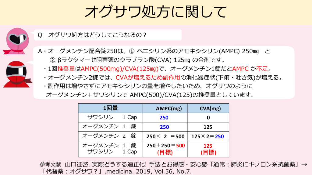 #7. オグサワ処方に関して Q オグサワ処方はどうしてこうなるの? A・オーグメンチン配合錠250は、① ペニシリン系のアモキシシリン(AMPC) 250㎎ と ② βラクタマーゼ阻害薬のクラブラン酸(CVA) 125㎎ の合剤です。 ・1回推奨量はAMPC(500mg)/CVA(125㎎)で、オーグメンチン1錠だとAMPC が不足。 ・オーグメンチン2錠では、CVAが増えるため副作用の消化器症状(下痢・吐き気)が増える。 ・副作用は増やさずにアモキシシリンの量を増やしたいため、オグサワのように オーグメンチン+サワシリンで AMPC(500)/CVA(125)の推奨量としています。 1回量 サワシリン AMPC(mg) 1 Cap CVA(mg) 250 0 オーグメンチン 1 錠 250 125 オーグメンチン 2 錠 250× 2 =500 125×2=250 オーグメンチン 1 錠 サワシリン 1 Cap 250+250=500 (目標) 125 (目標) 参考文献 山口征啓. 実際どうする適正化! 手法とお得感・安心感「通常:肺炎にキノロン系抗菌薬」→ 「代替薬:オグサワ?」.medicina. 2019, Vol.56, No.7.