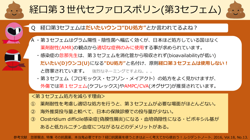 #8. 経口第3世代セファロスポリン(第3セフェム) Q 経口第3セフェムはだいたいウンコ“DU処方”とか言われてるよね? A ・第3セフェムはグラム陽性・陰性菌へ幅広く効くが、日本ほど処方している国はなく 薬剤耐性(AMR)の観点から適切な症例のみに使用する事が求められています。 ・感染症の忽那先生は、第3セフェムを消化管から吸収されず(bioavailabilityが低い) だいたい(D)ウンコ(U)になる”DU処方”と名付け、原則経口第3セフェムは使用しない! と啓蒙されています。 強烈なネーミングですよね。。。 ・第3セフェム(フロモックス・セフゾン・メイアクト)の処方をよく見かけますが、 外傷では第1セフェム(ケフレックス)やAMPC/CVA(オグサワ)が推奨されています。 <第3セフェム処方を減らす理由> ① 薬剤耐性を考慮し適切な処方を行うと、第3セフェムが必要な場面がほとんどない。 ② 海外推奨投与量と較べて、日本の保険診療での投与量が少ない。 ③ Clostridium difficile感染症(偽膜性腸炎)になる・血培偽陰性になる・ピボキシル基が あると低カルニチン血症につながるなどのデメリットがある。 参考文献 忽那賢志. 特集 その抗菌薬、本当鬼必要ですか?経口抗菌薬を使うときはよーく考えてから使おう!.レジデントノート. 2016, Vol.18, No.13.