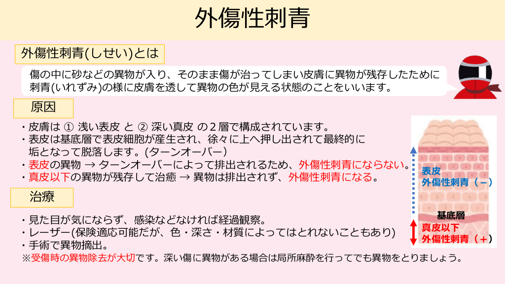 #9. 外傷性刺青 外傷性刺青(しせい)とは 傷の中に砂などの異物が入り、そのまま傷が治ってしまい皮膚に異物が残存したために 刺青(いれずみ)の様に皮膚を透して異物の色が見える状態のことをいいます。 原因 ・皮膚は ① 浅い表皮 と ② 深い真皮 の2層で構成されています。 ・表皮は基底層で表皮細胞が産生され、徐々に上へ押し出されて最終的に 垢となって脱落します。(ターンオーバー) ・表皮の異物 → ターンオーバーによって排出されるため、外傷性刺青にならない。 表皮 ・真皮以下の異物が残存して治癒 → 異物は排出されず、外傷性刺青になる。 外傷性刺青(-) 治療 ・見た目が気にならず、感染などなければ経過観察。 ・レーザー(保険適応可能だが、色・深さ・材質によってはとれないこともあり) ・手術で異物摘出。 基底層 真皮以下 外傷性刺青(+) ※受傷時の異物除去が大切です。深い傷に異物がある場合は局所麻酔を行ってでも異物をとりましょう。