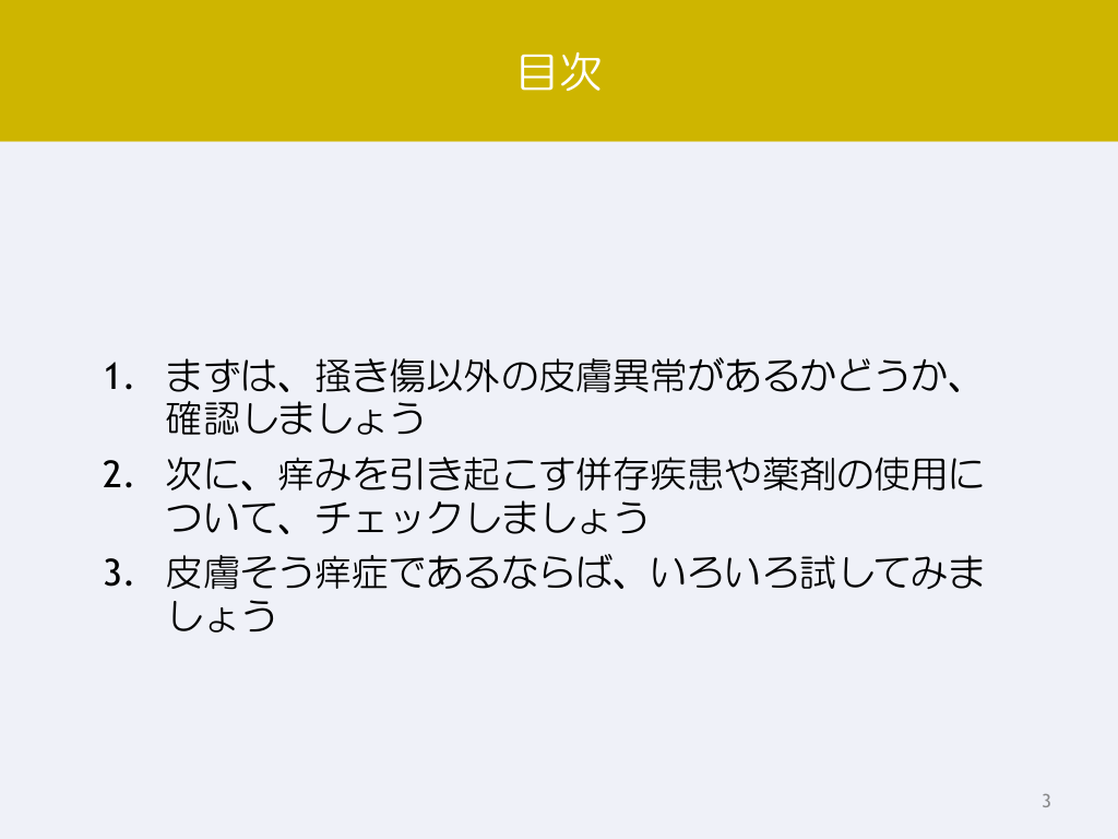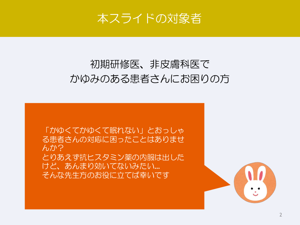 「かゆくてかゆくて眠れない」とおっしゃる患者さんの対応に困ったことはありませんか?とりあえず抗ヒスタミン薬の内服は出したけど、あんまり効いてないみたい…そんな初期研修医、非皮膚科医の先生のお役に立てば幸いです。