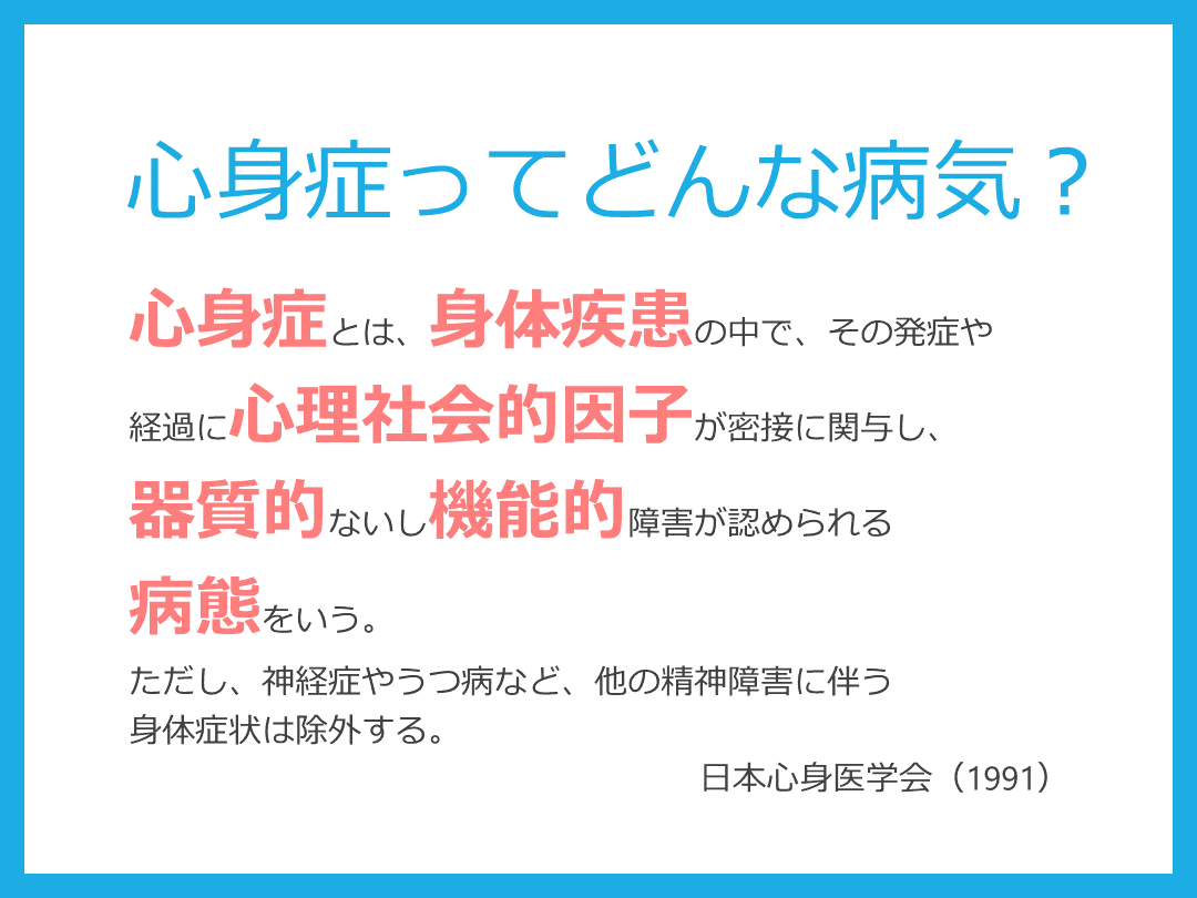 #11. 心身症ってどんな病気? 心身症とは、身体疾患の中で、その発症や経過に心理社会的因子が密接に関与し、器質的ないし機能的障害が認められる病態をいう。ただし、神経症やうつ病など、他の精神障害に伴う