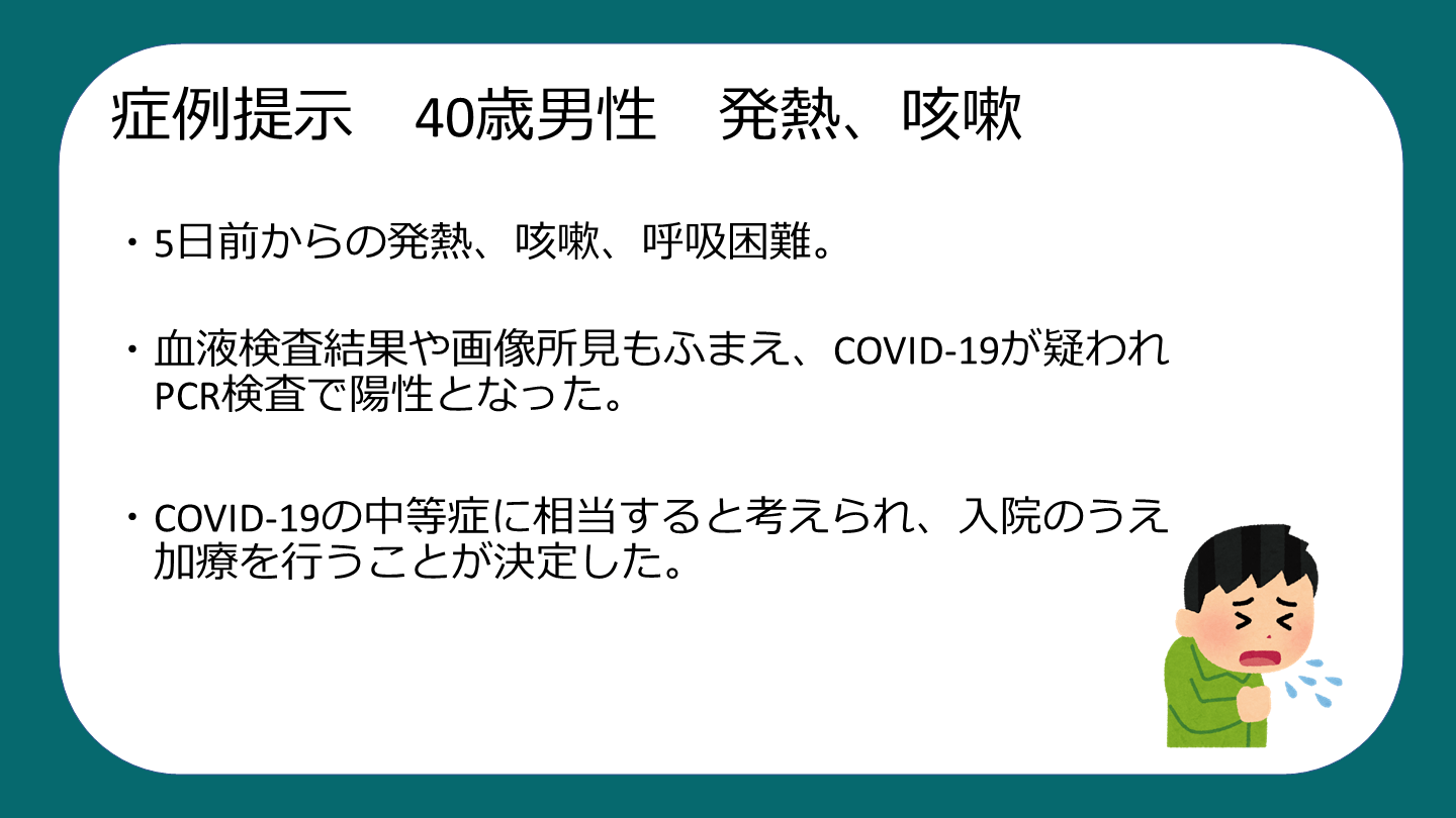 ・COVID-19の中等症に相当すると考えられ、入院のうえ 加療を行うことが決定した。